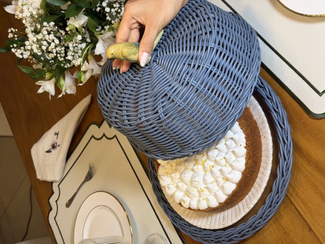 Boleira feita em vime caramelo com detalhe de puxador de arara. As peças em vime são o cargo chefe da mesa posta do café da manhã, rustico e charmoso na medida certa.