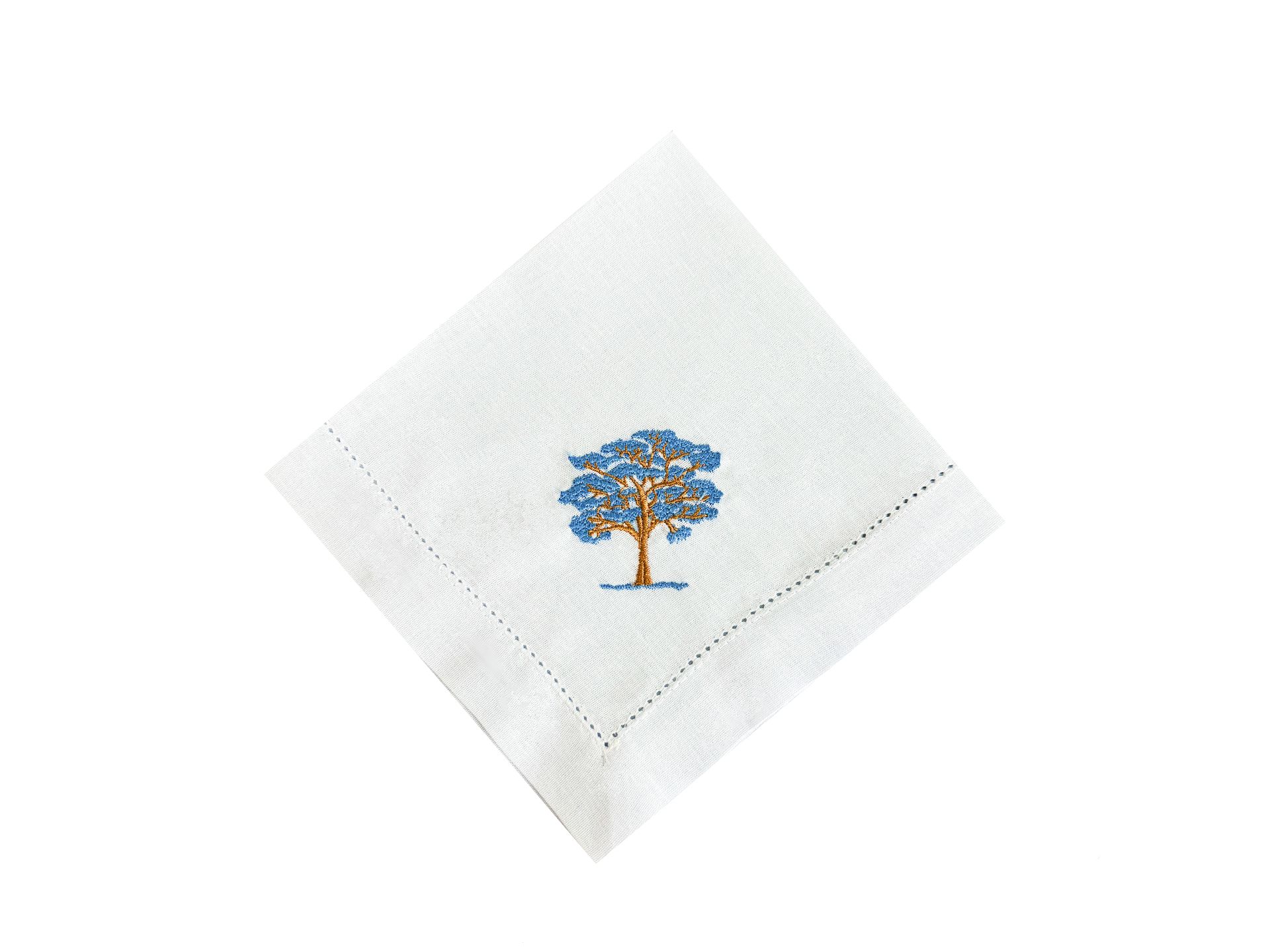 Guardanapo Bordado Ipê Azul, em tecido branco com bordado delicado e acabamento em ponto ajour.