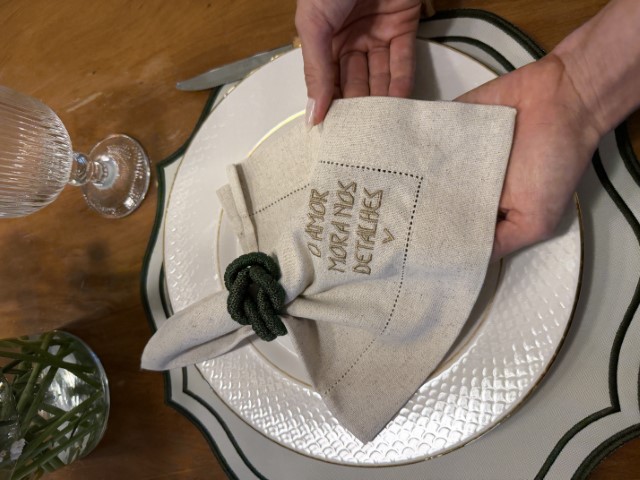 Guardanapo Bordado O Amor Mora nos Detalhes, em tecido branco com bordado delicado e acabamento em ponto ajour.