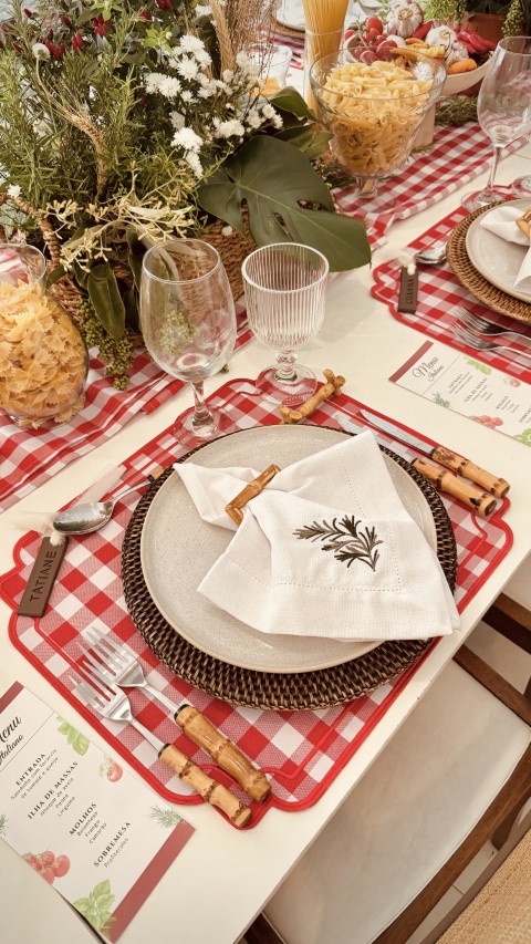 Jogo Americano Dupla Face com verso em tecido Impermeável na cor vermelha e frente em xadrez nas cores vermelho e branco, com bordado por todo contorno da peça, acabamento perfeito. Produzido no Brasil.