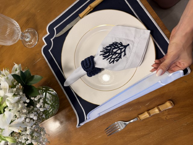 Jogo Americano Dupla Face retangular com verso em tecido Impermeável na cor marinho e off, com bordado por todo contorno da peça, acabamento perfeito. Produzido no Brasil.