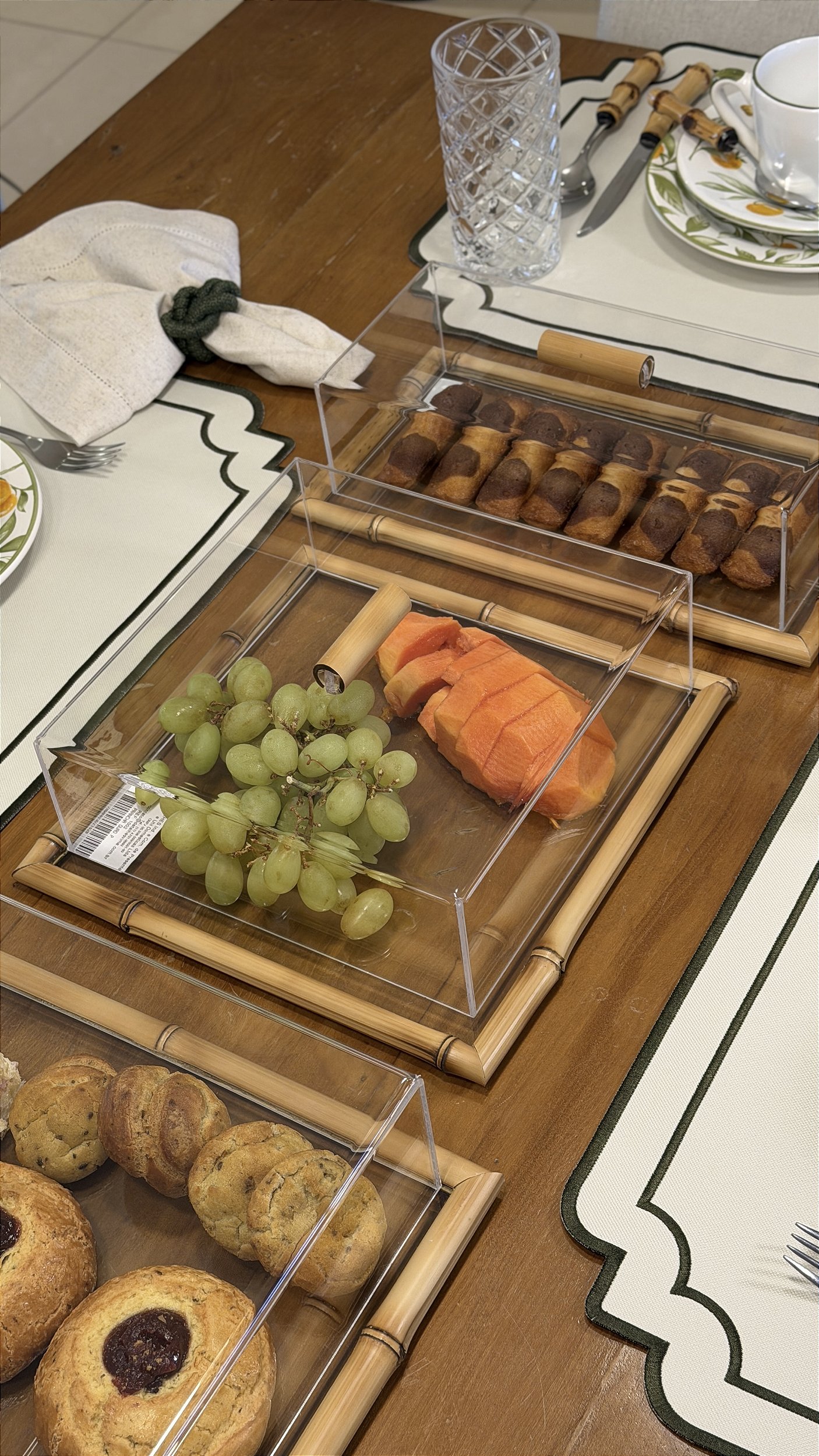 A tampa em acrílico completa o conjunto, proporcionando proteção aos alimentos preparados. Seu material transparente permite visualizar o conteúdo sem a necessidade de abrir a tampa, mantendo a frescura e os aromas preservados por mais tempo.
